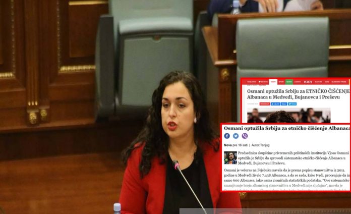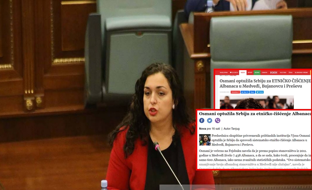 Vjosa Osmani akuzoi Serbinë për spastrim etnik të shqiptarëve (Osmani optužila Srbiju za etničko čišćenje Albanaca); “Osmani akuzoi Serbinë për spastrim etnik të shqiptarëve në Medvegjë, Bujanoc dhe Preshevë” (Osmani optužila Srbiju za etničko čišćenje Albanaca u Medveđi, Bujanovcu i Preševu), shkruan gazeta “Bota sot” duke ju referuar mediave serbe.