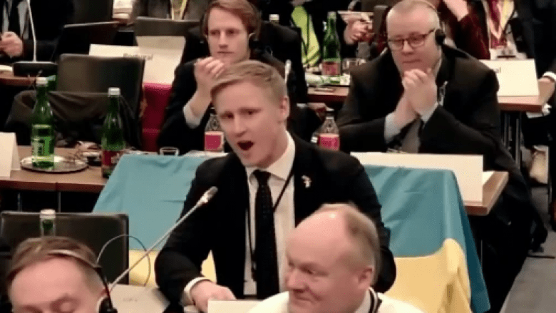 Një deputet letonez ishte aq i zemëruar me prezencën e një delegacioni rus në një takim të sigurisë së OKB-së, saqë filloi një fjalim të pasionuar që përfundoi me thënien e famshme të luftëtarëve ukrainase, “anije luftarake ruse, shko r.s.”.