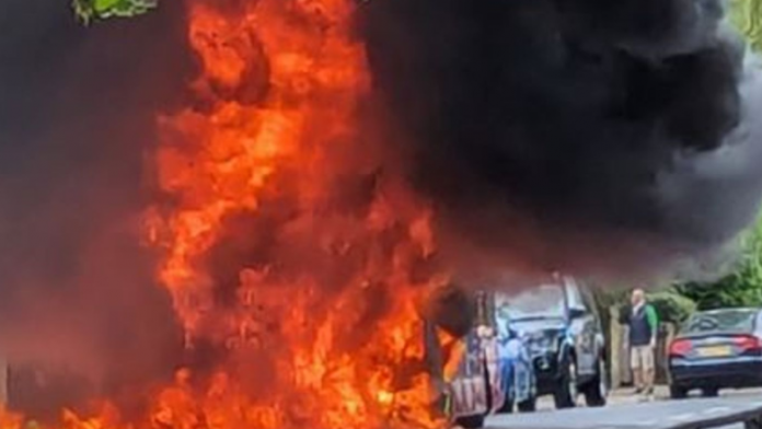 Nga pamjet e publikuara shihet autobusi i përfshirë nga flakët dhe tymi i zi i dendur që ngrihej në ajër.