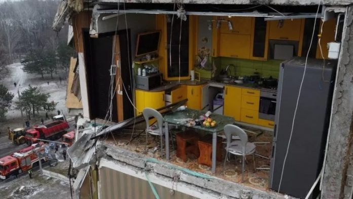 Ajo e krahasoi shkatërrimin e ndërtesës me fatin e vendit të saj: “Këto janë plagët në trupin e Ukrainës. Plagë në shtëpitë tona”.