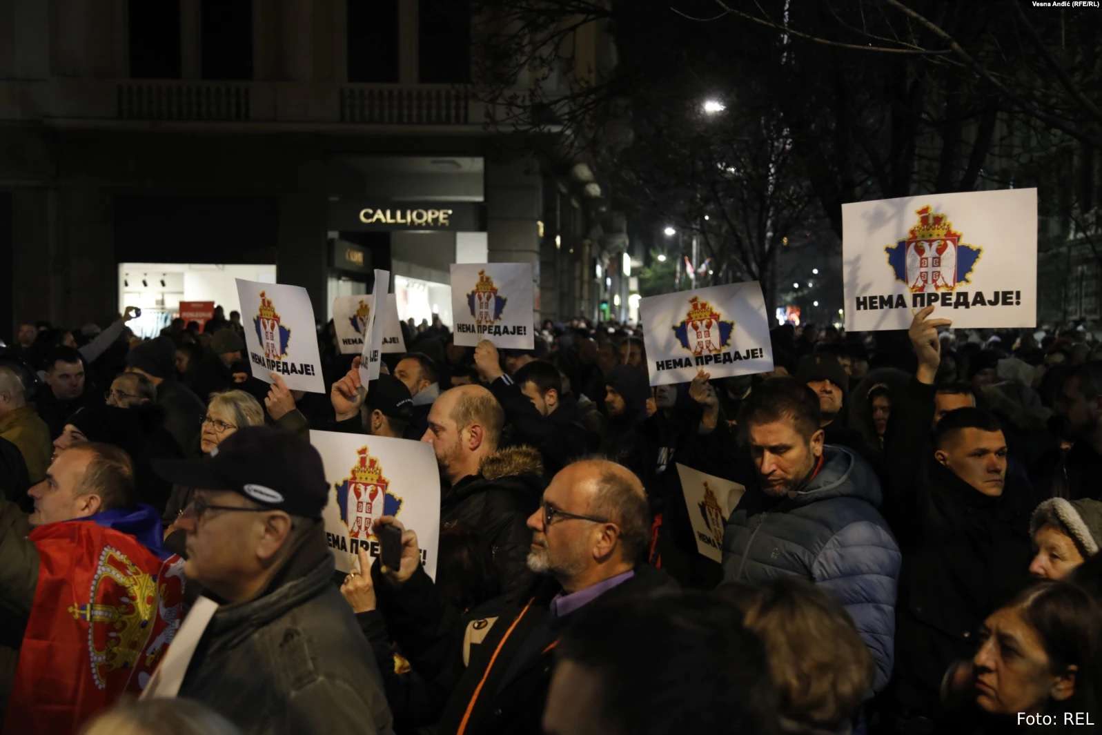 Djathtistët serbë janë mbledhur në Beograd më 15 shkurt për të protestuar kundër autoriteteve serbe dhe dialogut me Kosovën, që zhvillohet nën ndërmjetësimin e Bashkimit Evropian.