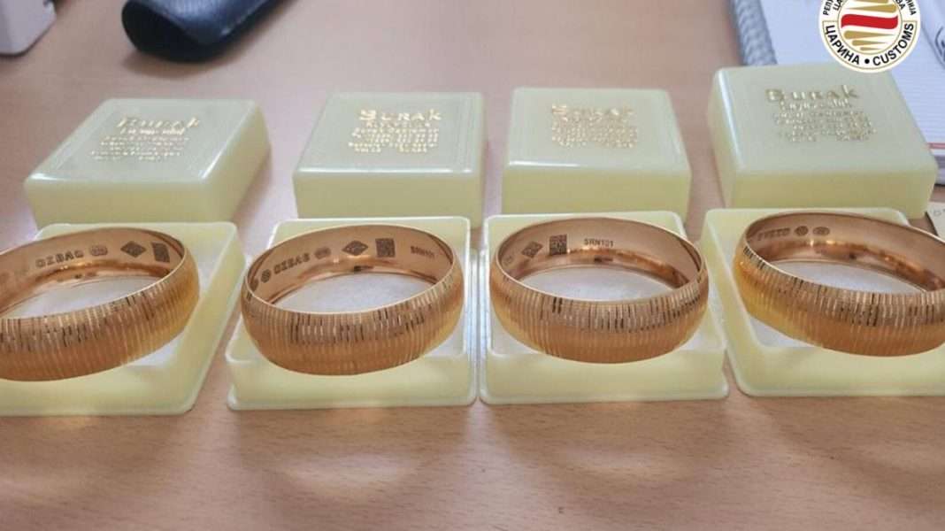 Janë sekuestruar katër byzylykë ari në vlerë prej 586.224 denarë me peshë totale prej 77,5 gram, pasi janë gjetur në çantën e një gruaje gjatë kontrollit të detajuar të automjetit të pasagjerëve në vendkalimin kufitar Bogorodicë. Pasagjerja nuk i ka paraqitur byzylykët në organet doganore, informojnë nga Drejtoria doganore.