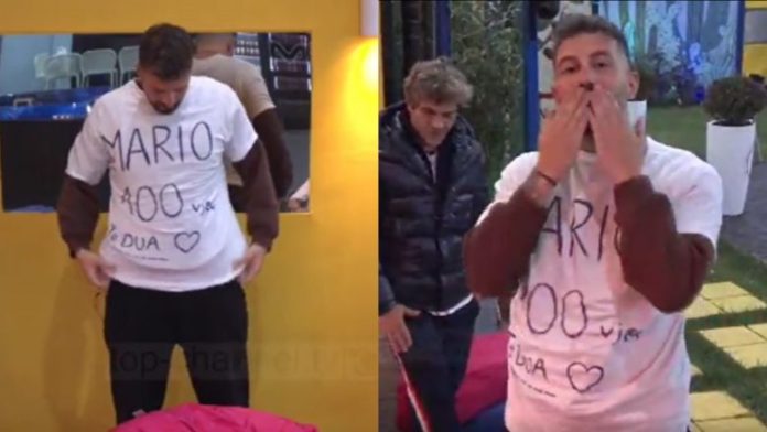 Aktori veshi një bluzë të bardhë ndërsa sipër saj shkruhet “Mario, 100 vjec, të dua”.