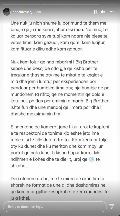 Ai në mesazhin e tij të gjatë ka falenderuar të gjithë mbështetësit, por edhe ka treguar se është penduar për humbjen që pësoi në “BBV”.