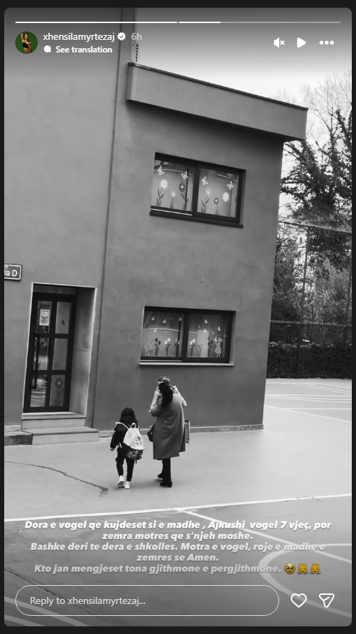 “Dora e vogel qe kujdeset si e madhe, Ajkushi vogel 7 vjeç, por zemra motres qe s’njeh moshe. Bashke deri te dera e shkolles. Motra e vogel, roje e madhe e zemres se Amen. Kto jan mengjeset tona gjithmone e pergjithmone”, shkroi ajo.