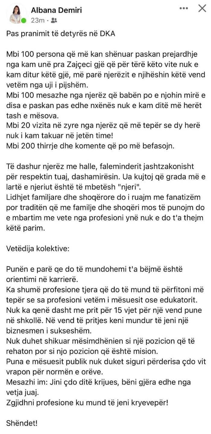 rejtoresha e re e Arsimit në komunën e Gjilanit, Albana Demiri, e cila u caktua në këtë detyrë ditë më parë nga kryetari i komunës, Alban Hyseni, ka shkruar një status në Facebook, ku ka shkruar për thirrjet e shumta dhe urimet që ka pranuar pas marrjes së detyrës, si dhe duke këshilluar që të mos pritet shumë vite për t’u punësuar si mësues, por të merren edhe me ndonjë biznes tjetër.