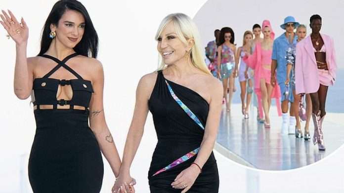 Dua Lipa dukej e pabesueshme teksa doli në pistën e Kanës me stilisten Donatella Versace të martën për të promovuar koleksionin e saj të ri me markën.