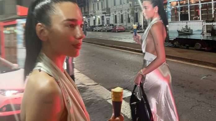 Ylli i muzikës pop, 27 vjeçe, dukej sensacionale me një fustan të argjendtë prej materialit të satenit, ndërsa po shijonte një mbrëmje gjatë pushimeve të saj italiane, shkruan DailyMail.