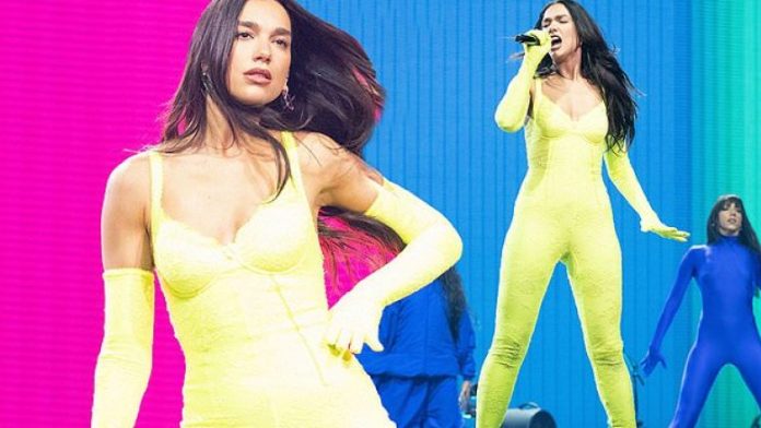 Dhe Dua Lipa dukej sensacionale e veshur me një kostum të verdhë të ngushtë të mërkurën teksa doli në skenë në arenën “The Forum”, Inglewood në Los Angeles, shkruan DailyMail.
