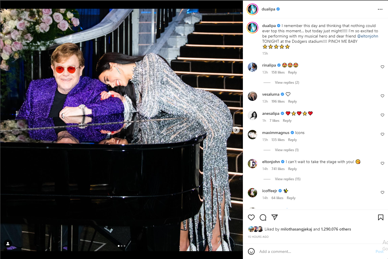 As Dua dhe as Elton nuk ishin të pranishëm në AMA, kjo sepse dyshja performuan bashkë në Doger Stadium në Los Angeles në kuadër të turneut të artistit 75-vjeçar.