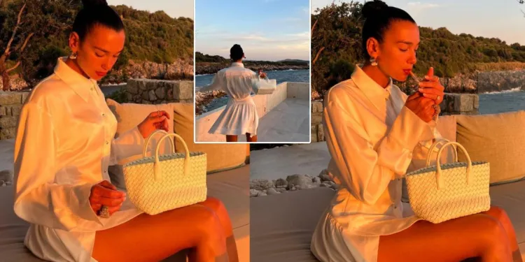 Dukja e saj u kombinua me një çantë të vogël gjithashtu të bardhë dhe aksesor, ndërsa shkrepi imazhet gjatë perëndimit të diellit.