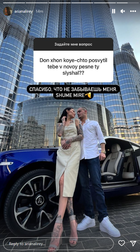 E në një pjesë të tekstit Don Xhoni i thotë dy fjalë për ish të dashurën e saj, modelen ruse, Ariana Lirey, shkruan lajmi.net.