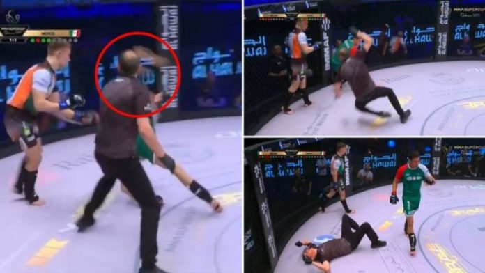 Problemi është se ishte një nokaut i zyrtarit Manhardt dhe ai ra në dysheme pas asaj goditje të fuqishme.