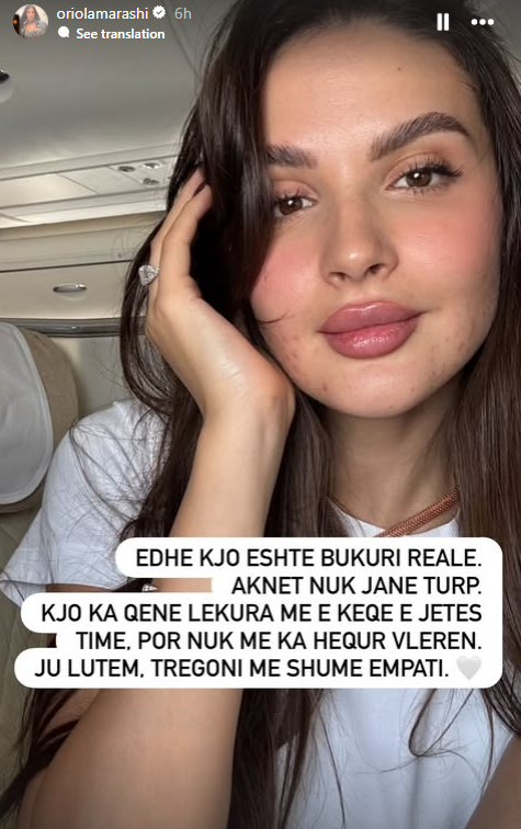 “Edhe kjo është bukuri reale. Aknet nuk janë turp. Kjo ka qenë lëkura më e keqe e jetës time, por nuk më ka hequr vlerën, ju lutëm, tregoni më shumë empati” shkroi Oriola.