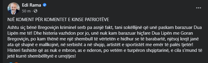 Në statusin e sotëm si një përgjigje ndaj komenteve të djeshme kryeministri Rama vijon të mbrojë Bregoviçin duke i cilësuar komentuesit si një grup që shpërndajnë vetëm histeri fashiste.