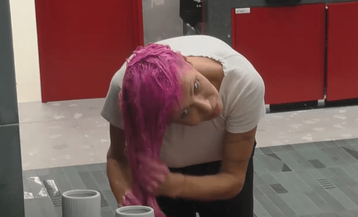 Ajo ka lyer flokët rozë, gjersa shfaqet duke e treguar të gjithë procedurën.