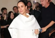 E veshur me një fund të gjelbër dhe një bluzë të bardhë, ndërsa vajza e saj mban një fustan rozë.