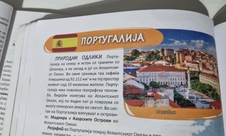 Teksti shkollor është ndoshta për gjeografinë dhe faqja e treguar flet për veçoritë natyrore të Portugalisë. Mirë po, në vend të flamurit të këtij vendi është vendosur flamuri i Spanjës, një flamur që nuk i ngjan aspak atij portugez.