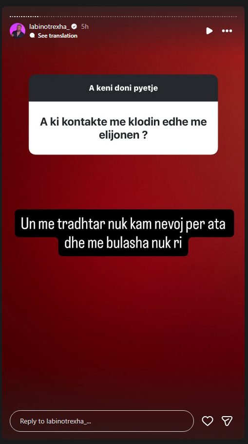 Kur u pyetur për Klodin dhe Elijonën ai u përgjigj: “un me tradhtar nuk kam nevojë per ata dhe me bulasha nuk rri”.