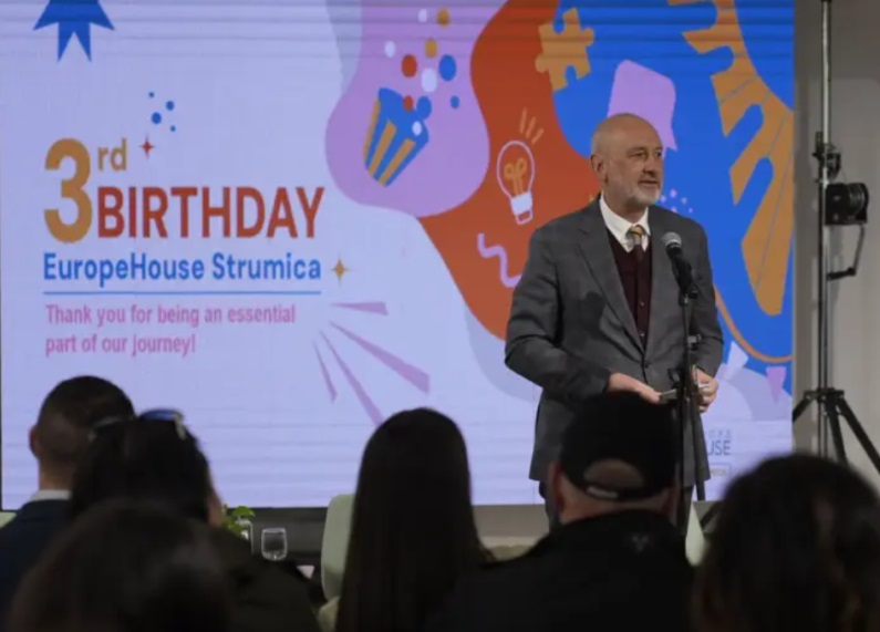 “Kur hyni në këtë derë, mos harroni se Europe House Kriva Pallankë nuk është vendi ku përfundon Bashkimi Evropian; përkundrazi, kjo është porta hyrëse për në Bashkimin Evropian dhe të ardhmen tuaj evropiane”, tha euroambasadori David Gir me rastin e këtij përvjetori.
