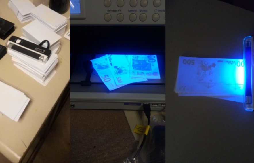 Në të njëjtën kohë, ata shtuan se te të dyshuarit u gjetën dy shishe me lëng, njëra me ngjyrë të verdhë dhe tjetra me ngjyrë të kuqe të errët, të cilat përdoren për të dalluar letrën e thjeshtë nga ajo në të cilën janë shtypur kartëmonedhat, si si dhe një llambë UV.