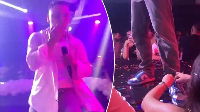 Kjo pasi në një video e cila është shpërndarë me të madhe në rrjetin social TikTok, një fanse e tij mund të shihet duke ia lidhur këpucët këngëtarit nga Prishtina.