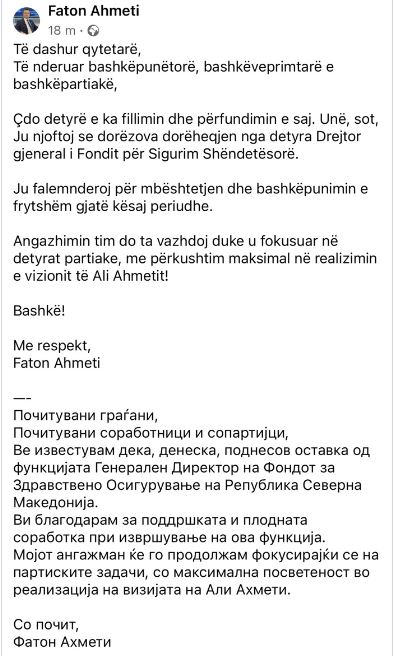“Çdo detyrë e ka fillimin dhe përfundimin e saj. Unë, sot, Ju njoftoj se dorëzova dorëheqjen nag detyra Drejtor gjeneral i Fondit për Sigurim Shëndetësor”, ka shkruar mes tjerash Ahmeti.