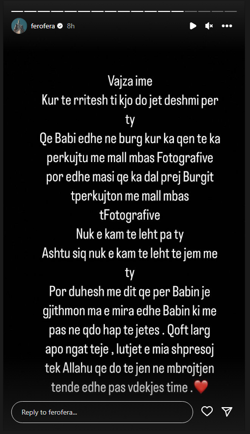 Pasi Arbenita Ismajli dha një mesazh kundrejt ish-bashkëshortit Feronit Shabani, ku theksoi se nuk ka gjasa për t’u ribashkuar me të dhe se po ia lejon vizitat me vajzën e tyre, ishte Fero ai i cili vendosi që t’i përgjigjej modeles.