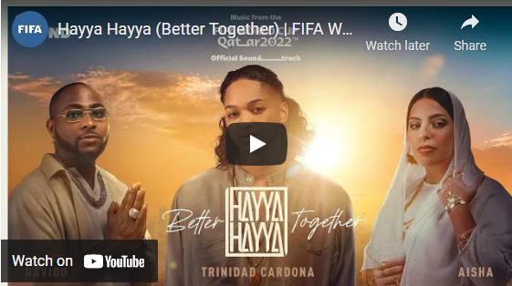 Kënga, e titulluar “Hayya Hayya (Better Together), ku këndojnë këngëtarja nga Katari Aisha dhe artistët amerikanë Trinidad Cardona dhe Davido.