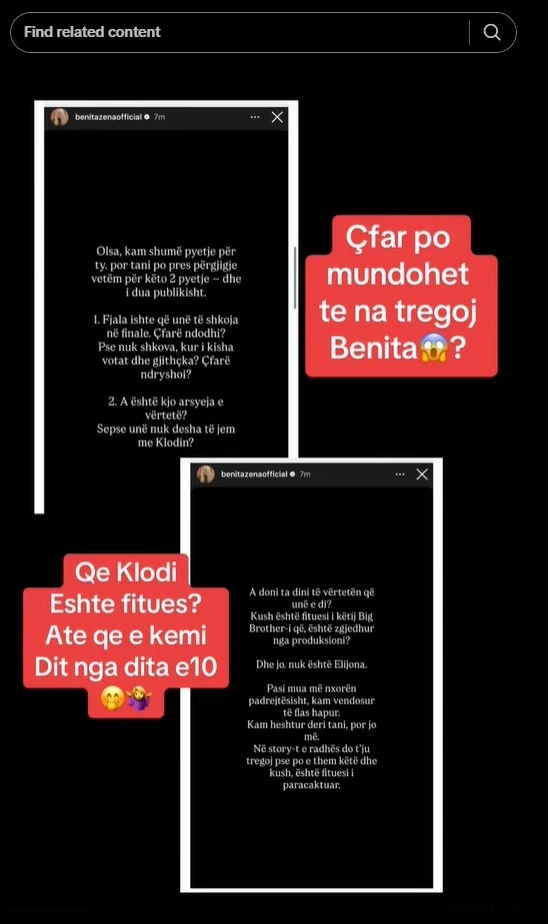 Në postimet e saj, Benita i drejtohet drejtpërdrejt producentes Olsa Muhameti, duke ngritur akuza për manipulim dhe skenarë të pambajtur: “Olsa, kam shumë pyetje për ty… Fjala ishte që unë të shkoja në finale. Çfarë ndodhi? Pse nuk shkova, kur i kisha votat dhe gjithçka? Çfarë ndryshoi?”