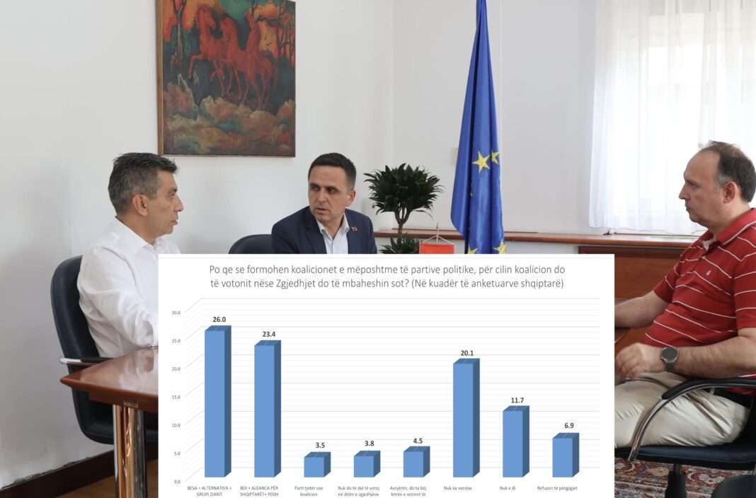 Koalicioni BESA-ALTERNATIVA-GRUPI I ZJARRIT dominon skenën politike shqiptare me 26.0%, ndërsa koalicioni i mundshëm BDI-ASH-PDSH 23.4%. Për parti tjetër apo koalicion janë deklaruar 3.8% e të anketuarve.