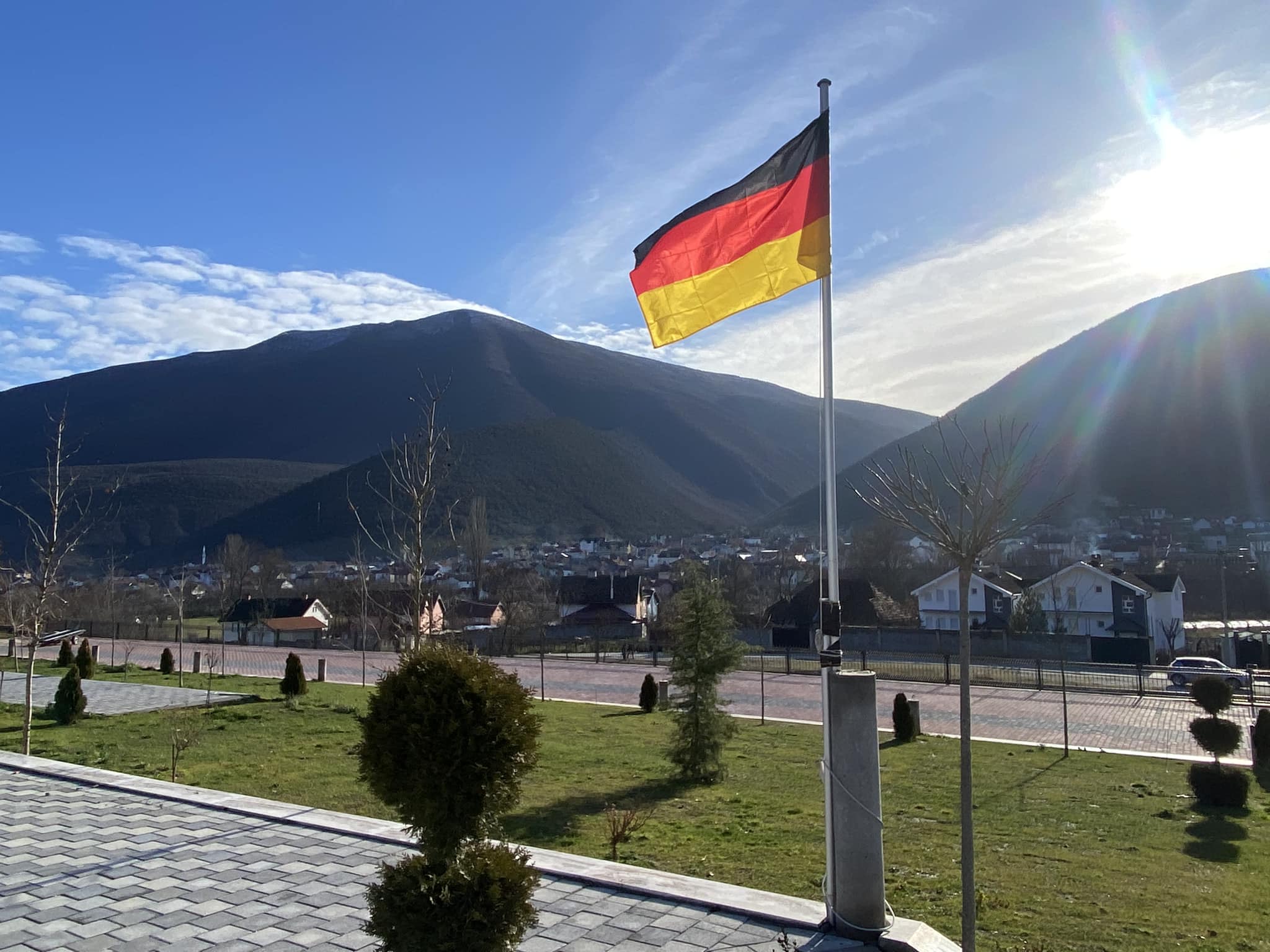 “Nuk jemi para ambasadës gjermane për të kërkuar vizë, por jemi në fshatin Radushë, dhe këtu para disa ditëve është shfaqur flamuri gjerman, të shohim cila është arsyeja e vendosjes së këtij flamuri në këtë fshat.”