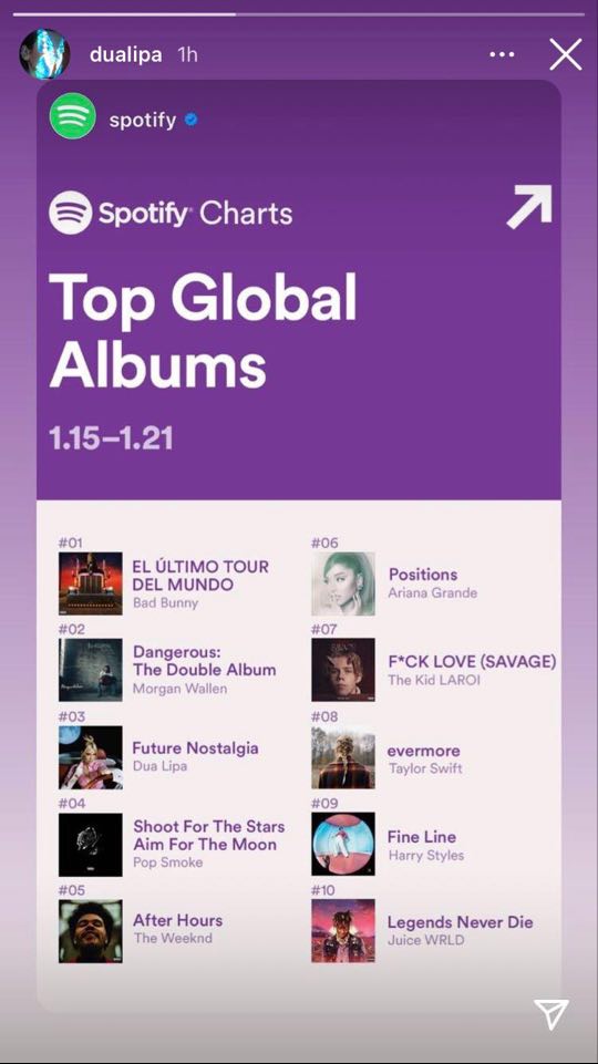 Me anë të postimit të fundit, artistja bëri të ditur se platforma Spotify, e renditi albumin “Future Nostalgia”, të tretin më të mirin në botë.