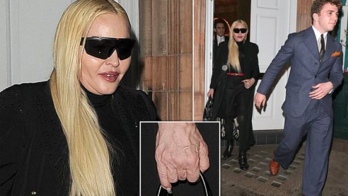 Madonna dukej shumë larg 63 viteve të saj, pasi ajo shfaqi një çehre shumë të tendosur ndërsa ishte për darkë në Harrys Bar, në Mayfair të Londrës në orët e para të mëngjesit të së shtunës.