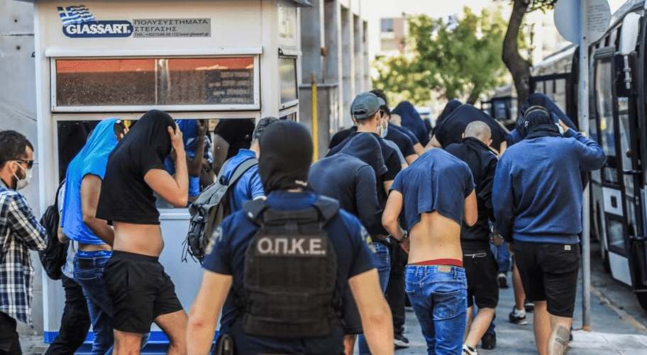 Të rinjtë e arrestuar – shumica e të cilëve e mbuluan kokën me fanellat e tyre për ta fshehur identitetin – dolën para gjykatësit një ditë pasi një tifoz 29-vjeçar grek u ther me thikë për vdekje pranë stadiumit të AEK-ut të Athinës, duke e shkaktuar anulimin e ndeshjes kualifikuese mes klubit grek dhe Dinamo Zagrebit në Ligën e Kampionëve.