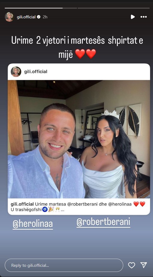 Ajo më anë të një InstaStory, ka publikuar një foto të çiftit më anën e të cilës ka zgjedhur për ta uruar djalin Robertin dhe nusen e tij Herolinden, shkruan lajmi.net.