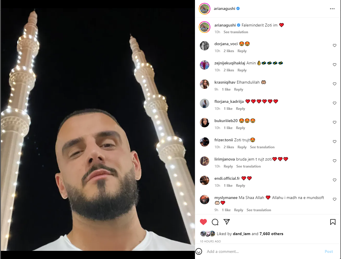 “Faleminderit Zoti im”, shkroi në mbishkrimin e postimit ku brenda pak minuta mori pëlqime të shumta nga fansat e tij./Lajmi.net/