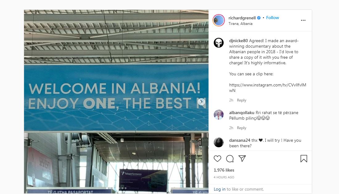 “Amerikanët duhet ta vizitojnë Tiranën. Njerëzit janë të mahnitshëm”, ka shkruar Grenell në rrjetin social Instagram.