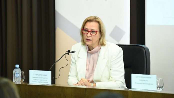 Zv. kryeministrja përgjegjëse për politikë për qeverisje të mirë, Slavica Grkovska, në konferencën e dytë për mediat për draftin strategjik për transparencë 2023-2026, e cila është mbajtur në Veles, e organizuar nga Kabineti për politikë dhe qeverisje për qeverisje, në me bashkëpunim me Fondacionin “Metamorfoza”.