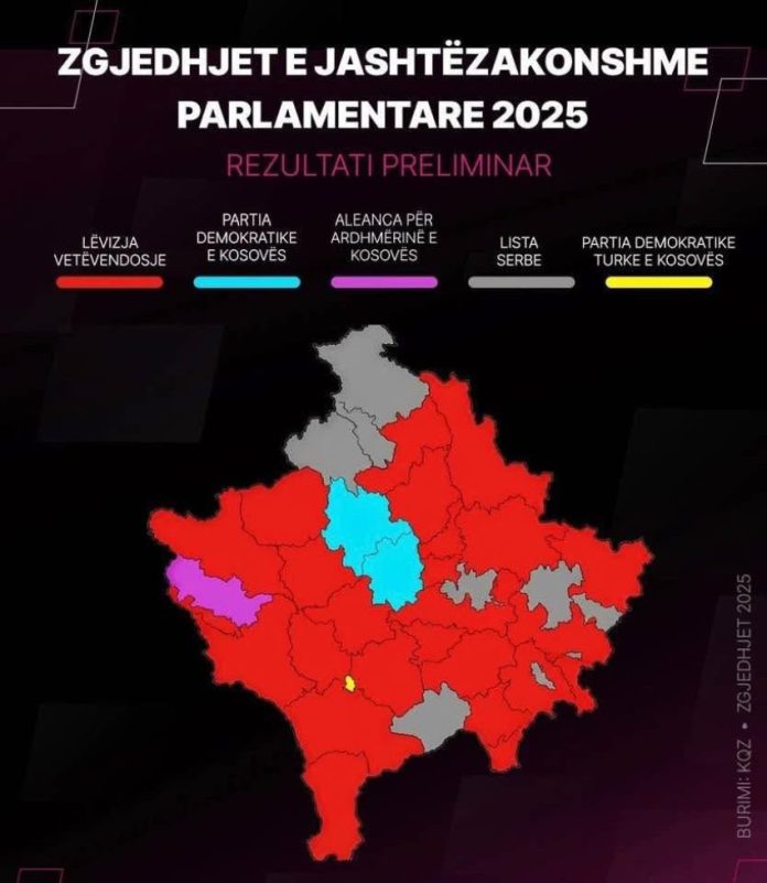 Në një hartë të publikuar me ngjyra sipas rezultateve të zgjedhjeve, nga ngjyra e kuqe që përfaqëson Vetëvendosjen, e gjithë Kosova është ‘skuqur’.