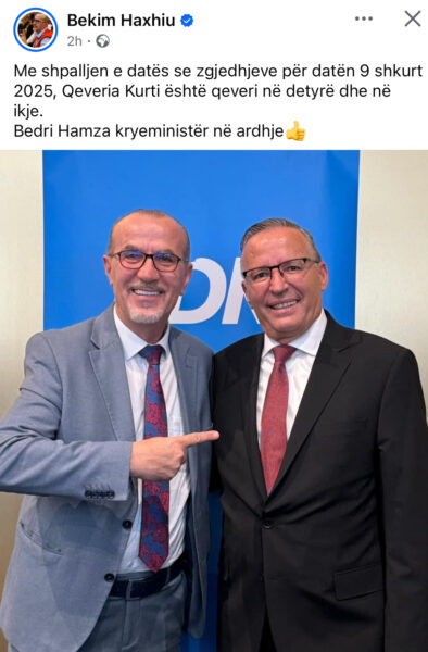 “Me shpalljen e datës se zgjedhjeve për datën 9 shkurt 2025, Qeveria Kurti është qeveri në detyrë dhe në ikje. Bedri Hamza kryeministër në ardhje”.