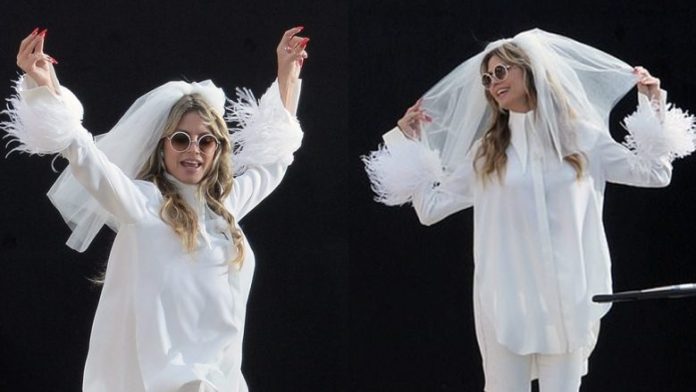 Bomba 50-vjeçare, e cila sapo publikoi një këngë me Tiesto, mbante një vello të bardhë mbi flokët e saj bionde.
