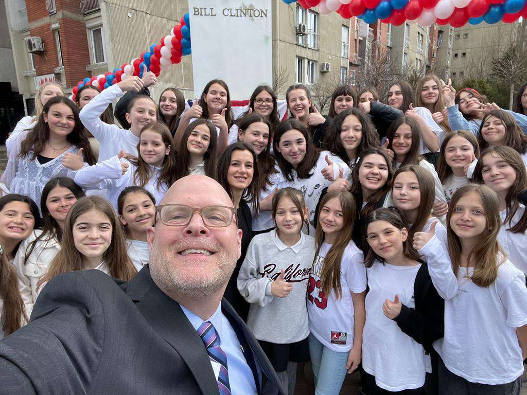 Hovenier ‘selfie’ me nxënësit e shkollës “Xhemajl Mustafa”, te shtatorja e presidentit Bill Clinton në Prishtinë