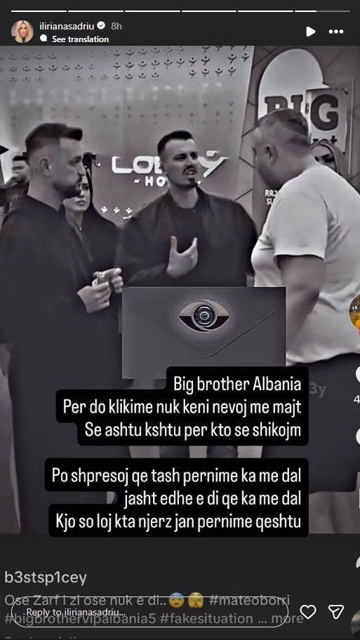 “Big Brother Albania, për do klikime nuk keni nevojë me majtë, se ashtu-kështu për këtë s’e shikojmë. Po shpresoj që tash përnime ka me dalë jashtë edhe e di që ka me dalë. Kjo s’është lojë, këta njerëz janë përnime qeshtu”, ka shkruar ajo.