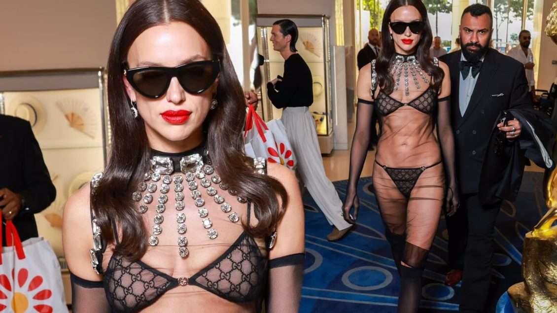 Modelja, 37 vjeçe, shfaqi fizikun e saj të tonifikuar me të brendshme gjysmë të tejdukshme dhe një palë të brendshme të stolisur me gurë të çmuar ndërsa shëtiti nëpër Hotel Martinez.