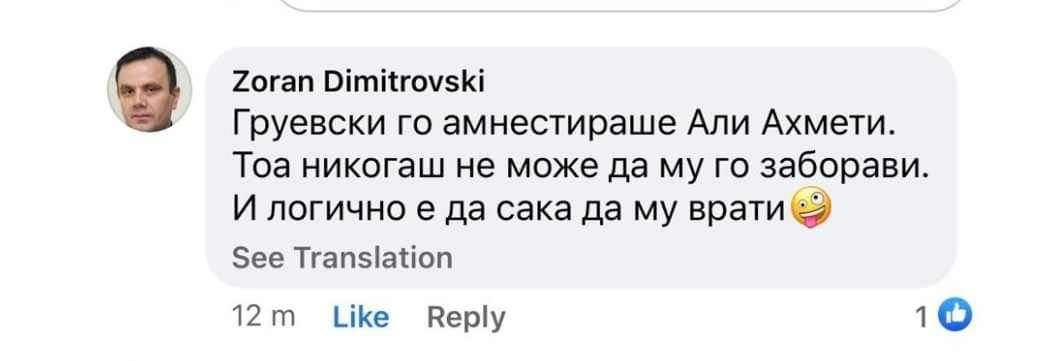 Ish-zevendesministri per Pushtet Lokal ne nje paraqitje te tij ne facebook duke debatuar per kumtesen e fundit te Presidences, lidhur me sic u tha ne kumtese “njerez te opozites qe kishin kërkuar nga presidenti ta amnistoj Gruevskin”, ka shkruar se “edhe Gruevski e kishte amnistuar Ali Ahmetin”.