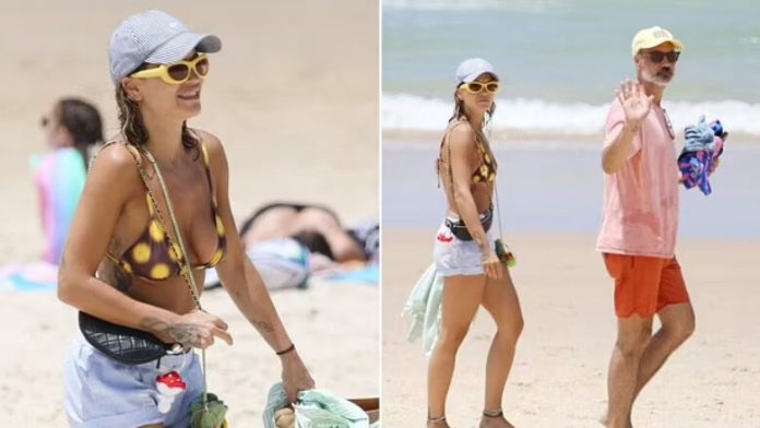 Tatuazhet e Ritës ishin plotësisht të dukshme ndërsa ecte pa këpucë mbi rërë, duke mbajtur një këmishë të lehtë të gjelbër dhe të bardhë me shirita për kohën kur era e freskët filloi të frynte.