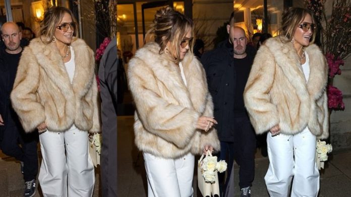 Jennifer Lopez dukej magjepsëse, teksa doli me një pallto leshi dhe syze dielli të mëdha për “Javën e Modës” në Paris të hënën.