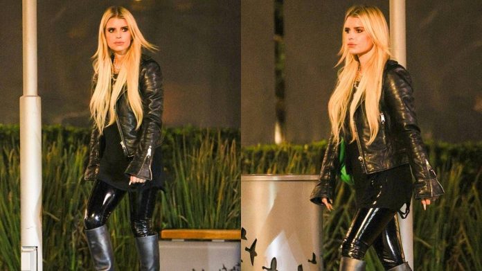 Ajo tregoi këmbët e saj marramendëse në një set pantallonash lëkure të zeza të ngushta dhe e ekuilibruar me mjeshtëri në një palë çizme me taka të larta, shkruan DailyMail.