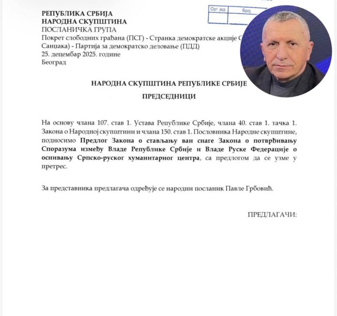 Në kuadër të grupit parlamentar me SDA e Sanxhakut dhe Lëvizjen e qytetarëve të lirë (PSG) i dorëzuam Kuvendit Popullor të Republikës së Serbisë propozimin për shfuqizimin e ligjit që ratifikon marrëveshjen ndërmjet Qeverisë së Serbisë dhe Qeverisë së Federatës Ruse për themelimin e Qendrës Humanitare Serbo-Ruse.